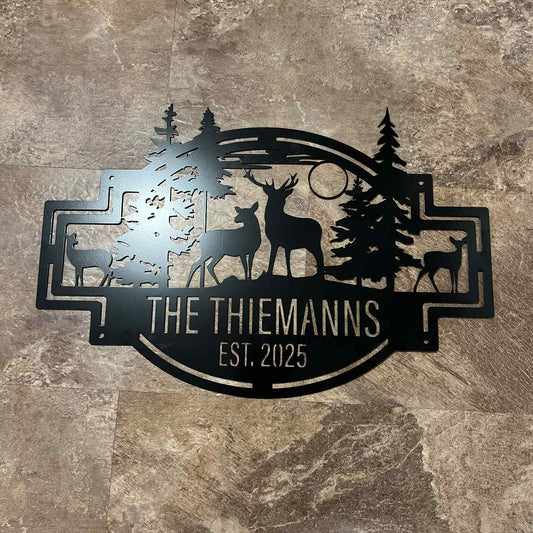 Modern Geometric Metal Sign with Deer and Evergreen Trees