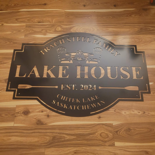 Modern Geometric Metal Lake Address Sign with Oars and Campfire